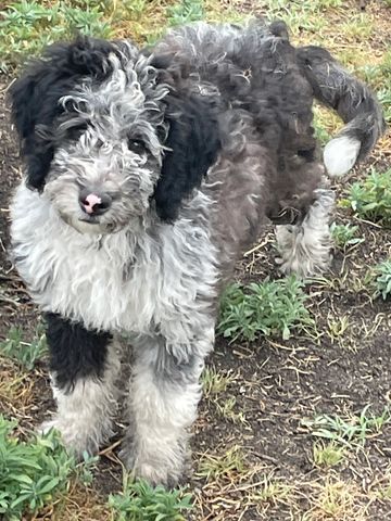 Gus is our green/gold eyed, F1 AussieDoodle Stud. He’s a big, goofy, fuzzy muppet of a dog and a great cow dog!! He carries locusG fade gene, rare brindle point carrier, carries chocolate, and has double furnishings (super whiskered face). Gus has all the Genetic and Hereditary testing done. He is fur tested 98% hypoallergenic, color tested and DNA. #54 lbs. Super great paired with a Bernedoodle or Poodle. $200 refundable deposit to hold him.